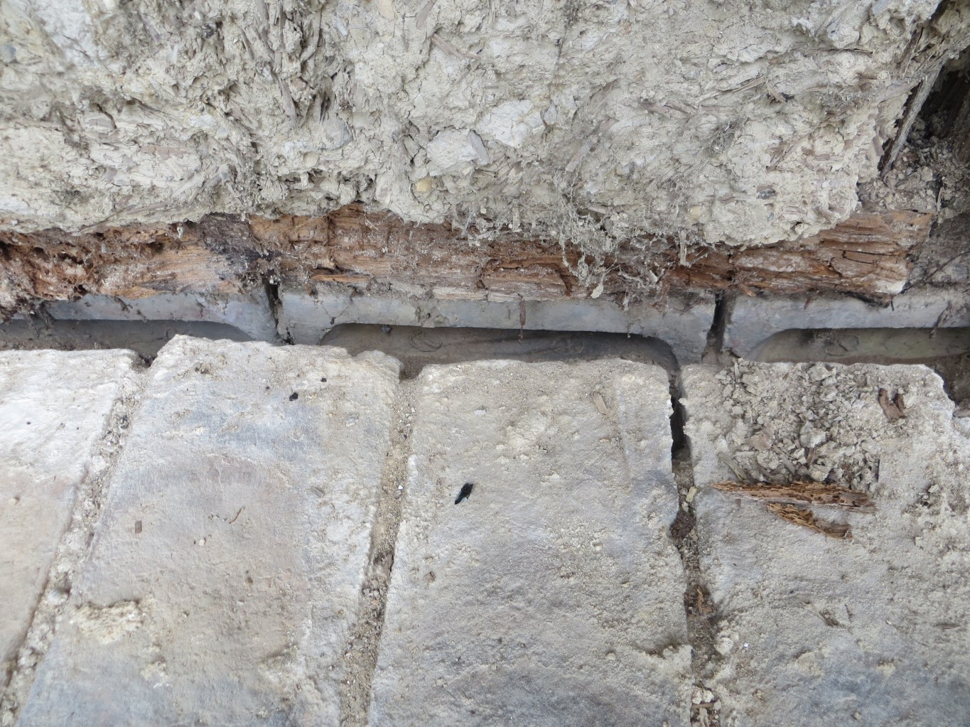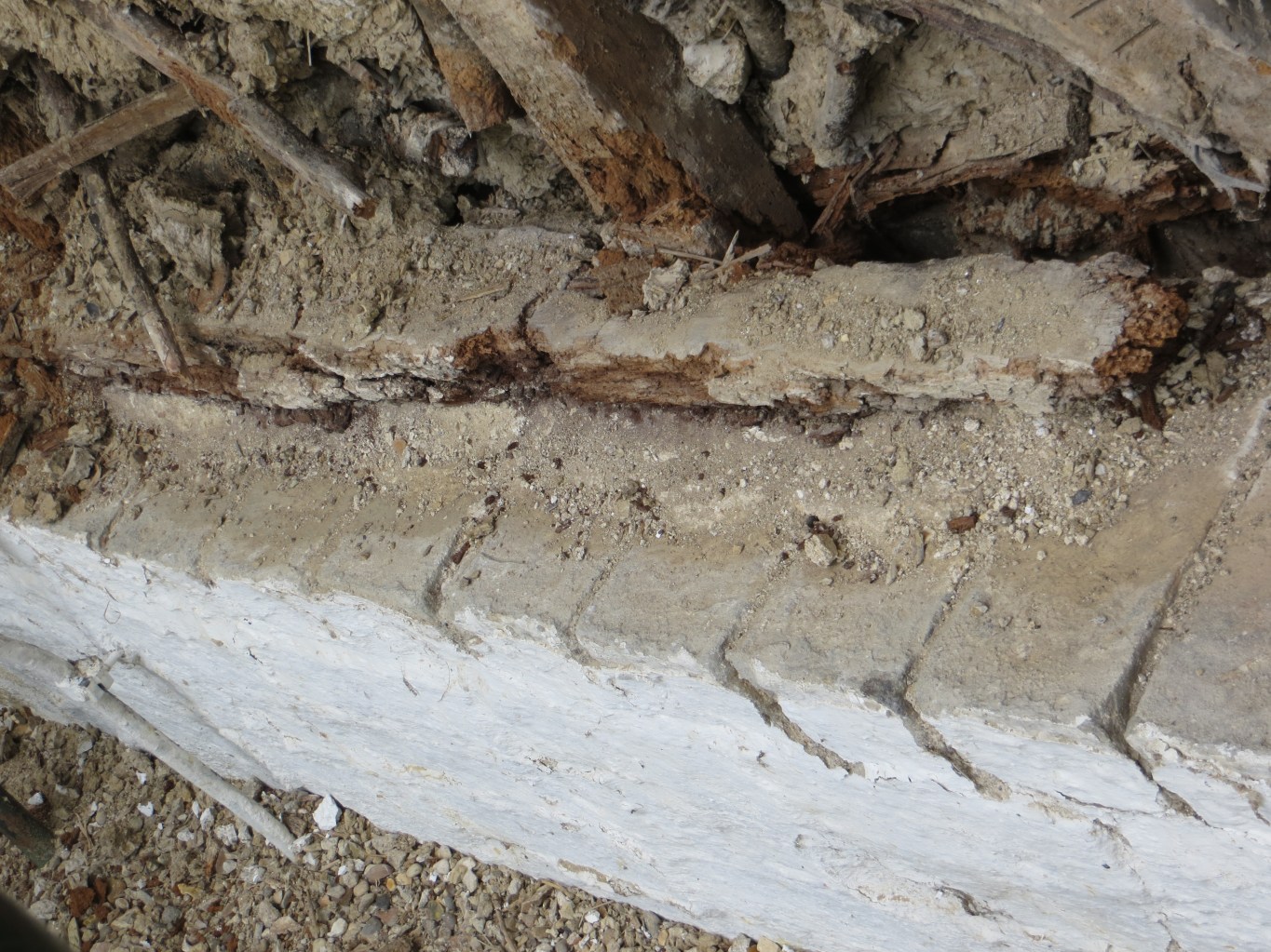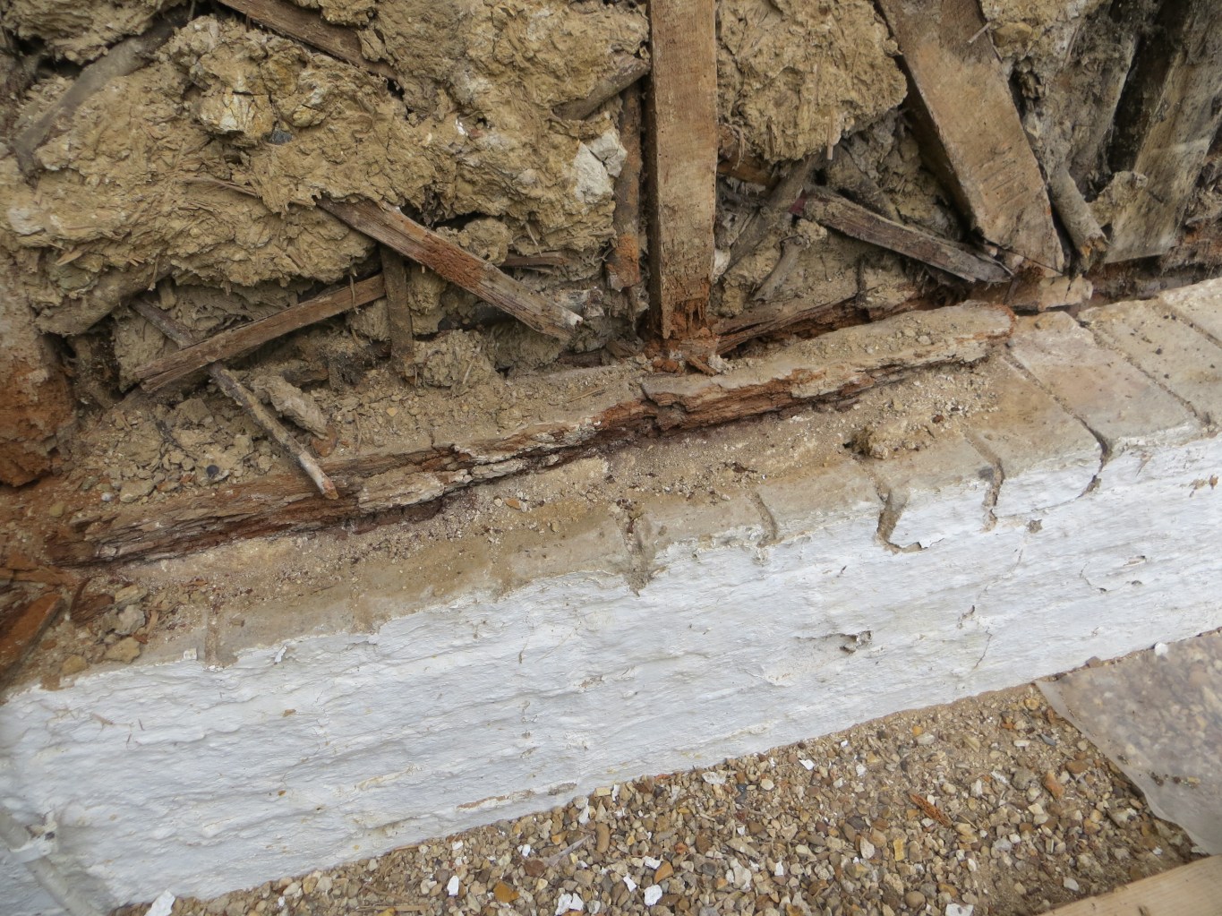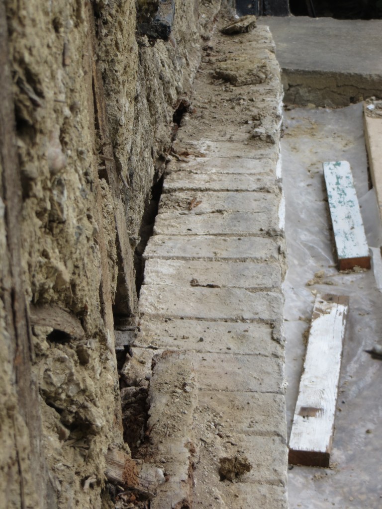 The sole plate which is the big beam of wood that goes across the building at its foot and in which the posts which make the walls and hold up the roof sit, was virtually non existent: rotted away to almost nothing, you can just see some remains of it on the left and right back in under the posts. The posts have almost no base to sit in just the very back bit of the sole plate which is resting on the 2nd grey brick plinth put behind the original you can see, but is crumbly not solid, so they look like are are ‘hanging’.