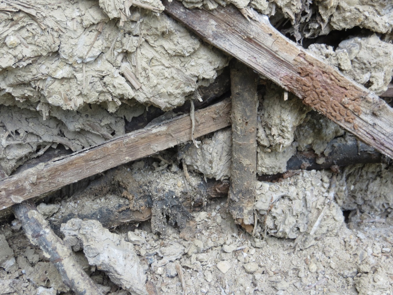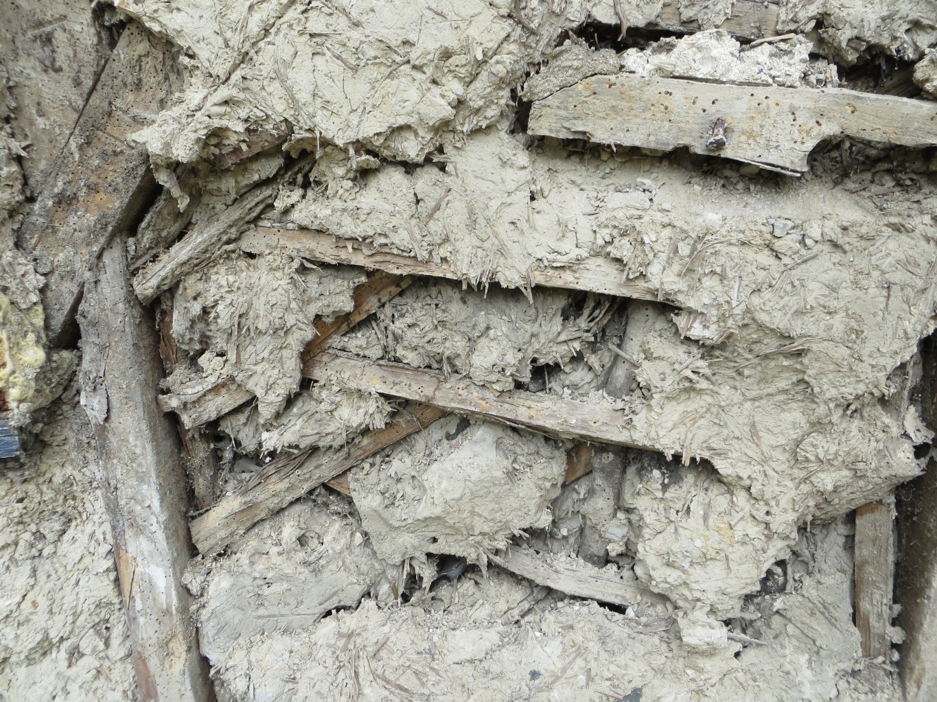 Crude and clumsy wattling means the clay is very balley / lumpy with lots of gaps as the wattles are the opposite of smooth profile. Some nails used just to add very stout short withies with no bend in them on top adding to the depth and difficulty of daubing smoothly. Of course the daub can be broken up and re-used but I would say most of the withies are dried out beyond re bending so hazel rods will be needed in the spring. Additional daub from the garden of course.