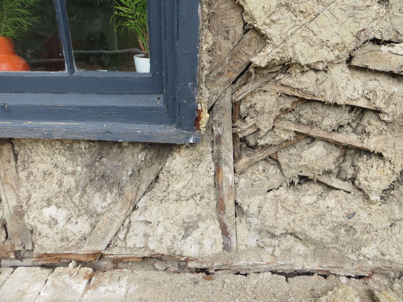 Another reason for that failure could be that a brace (a timber placed diagonally across several posts to stop a building moving sideways ( / or \ ) has been cut in half in order to allow room for the window frame – probably added at a later date than original build. Its at the point where this cut brace and this very slender post meet that the wall has caved in a bit and the leaning wall and all the other bits follow this a little – the epi centre of the failure. (Although roof spread creates the force to push top of walls out and hence bottom of walls in, good timbers can resist this for some time but- a weak / weakened timbers succumb.)