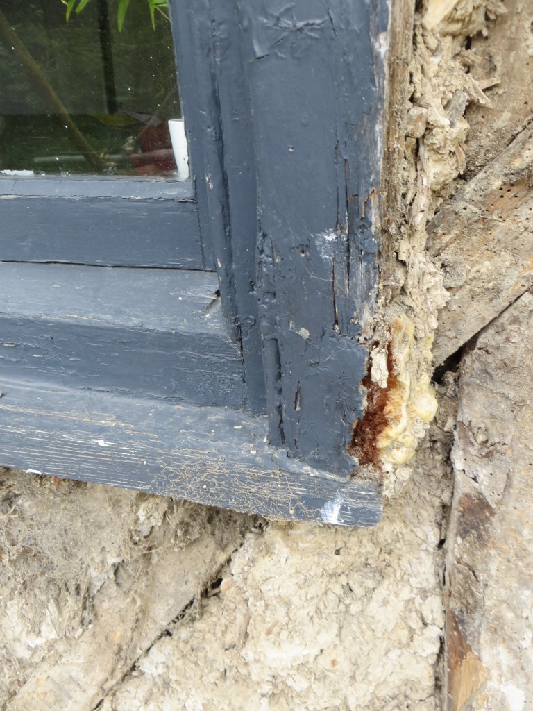 Been living here for 10 years now and the front wall is in the pretty much same state as when we moved in, but some more cracks have appeared over the last winter in the concrete(!) render applied by previous owners. Its not possible to tell if its just the render or more … but as you will see from the lean of the wall and window we cant take the risk of just leaving it. When purchasing surveyors said it was stable though fragile and leave as is often the best policy in these situation where such buildings can cope with such lean for centuries. But recent inspection by engineer reports we should strap to restrain roof spread, find and fix failed timbers and implement some permanent additional support v roof spread, asap as any more inches of spread would be v bad. Engineer also identified decayed wall plate immediately under upstairs window as in need of replcement.