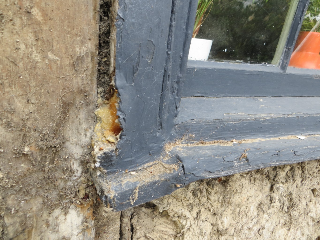 This view taken from the inside show how far the window frame and plinth have parted ways on the left of the frame (from the inside).