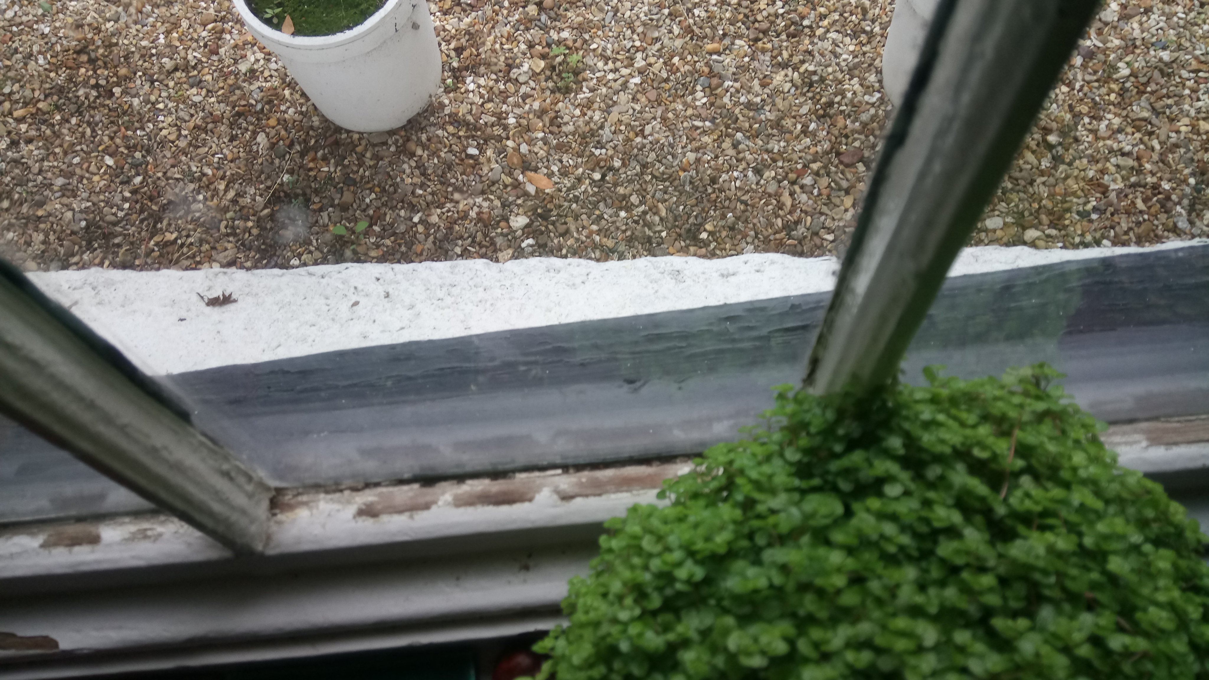 This view taken from the inside show how far the window frame and plinth have parted ways on the left of the frame (from the inside).